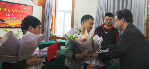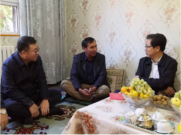 10月16日,刘克勤理事长(右一)在伊宁市看望慰问自治区见义勇为先进分子巴图尔•阿合买提(右二)