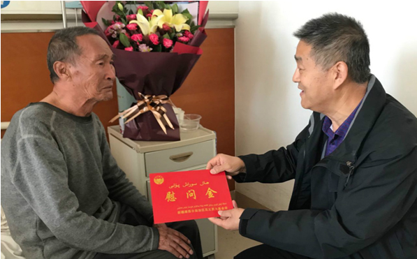 11月4日,基金会工作人员在新疆医科大学第一附属医院看望全国见义勇为英雄群体代表张付云(左一),并送上慰问金